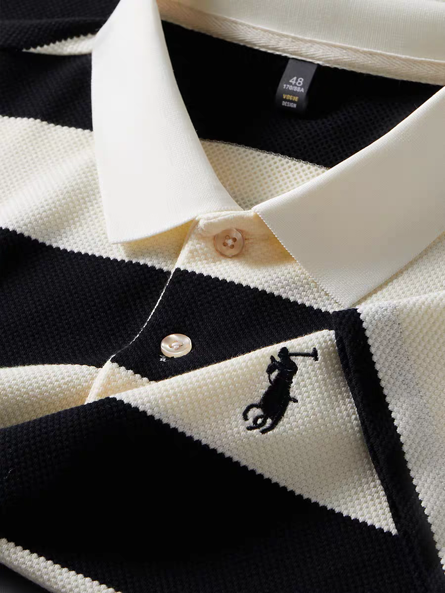 • Elevate your smart-casual wardrobe with the Saddlecrest Regal Stripe Polo T-Shirt, tailored for those who value refinement and confidence.